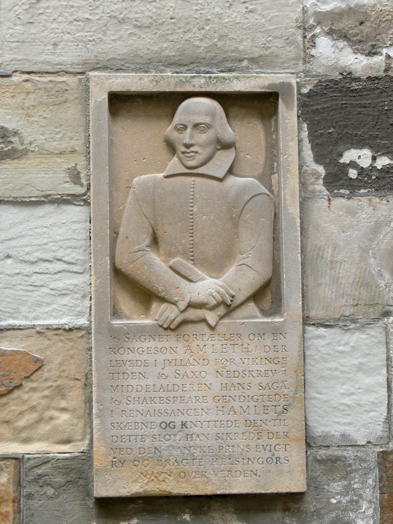 Danish, on plaque: ‘sagnet fortæller om en kongesøn Amleth der levede i Jylland før vikinge tiden. & Saxo nedskrev i middelalderen hans saga. & Shakespeare gendigtede i renaissancen Hamlets skæbne og knyttede den til dette slot. Han sikrede der ved den danske prins evigt ry og bragte Helsingørs navn over verden.’ ‘Legend tells of a king’s son Amleth who lived in Jutland before Viking times. & Saxo wrote his saga in the Middle Ages. & Shakespeare retold Hamlet’s fate in the Renaissance, and tied it to this castle. Thereby he secured the reputation of the Danish Prince forever, and spread the name of Elsinore all around the world.’