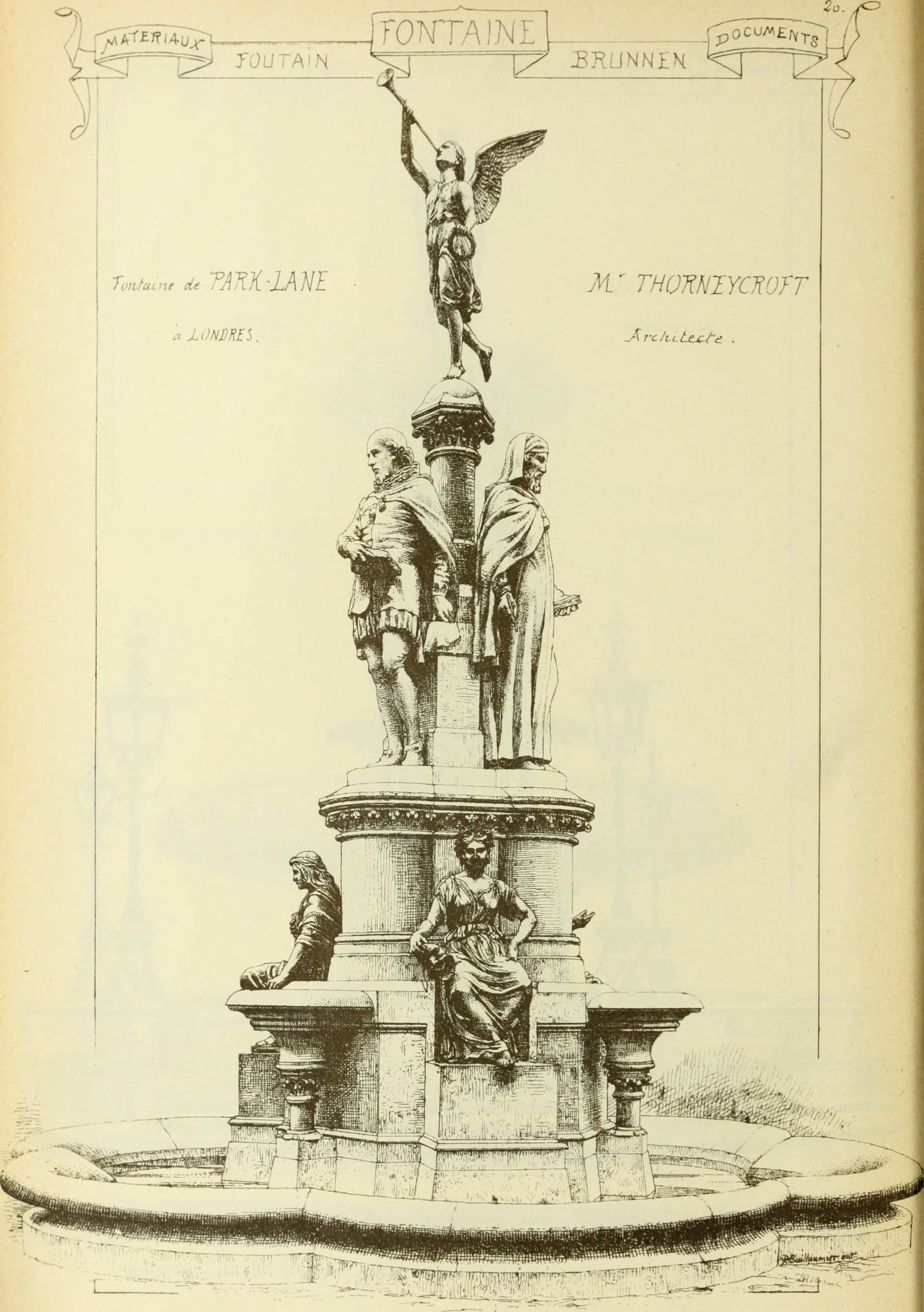 From Wikipedia: ‘The fountain included a basin, with seated bronze statues representing the muses of Comedy, Tragedy and History. Above and between them were standing marble statues of Shakespeare (facing towards Hyde Park), Chaucer (facing towards Piccadilly) and Milton (facing down Park Lane). The statue of Shakespeare was between the figures of Tragedy and Comedy, Milton between Tragedy and History, and Chaucer between Comedy and History.’