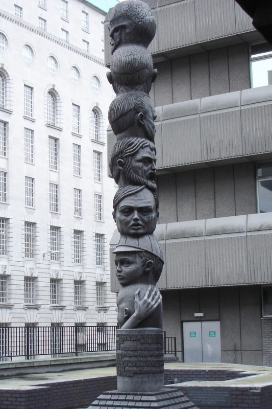 Column made up of seven stacked heads representing each ‘age’ described in Jaques’ speech in As You Like It.