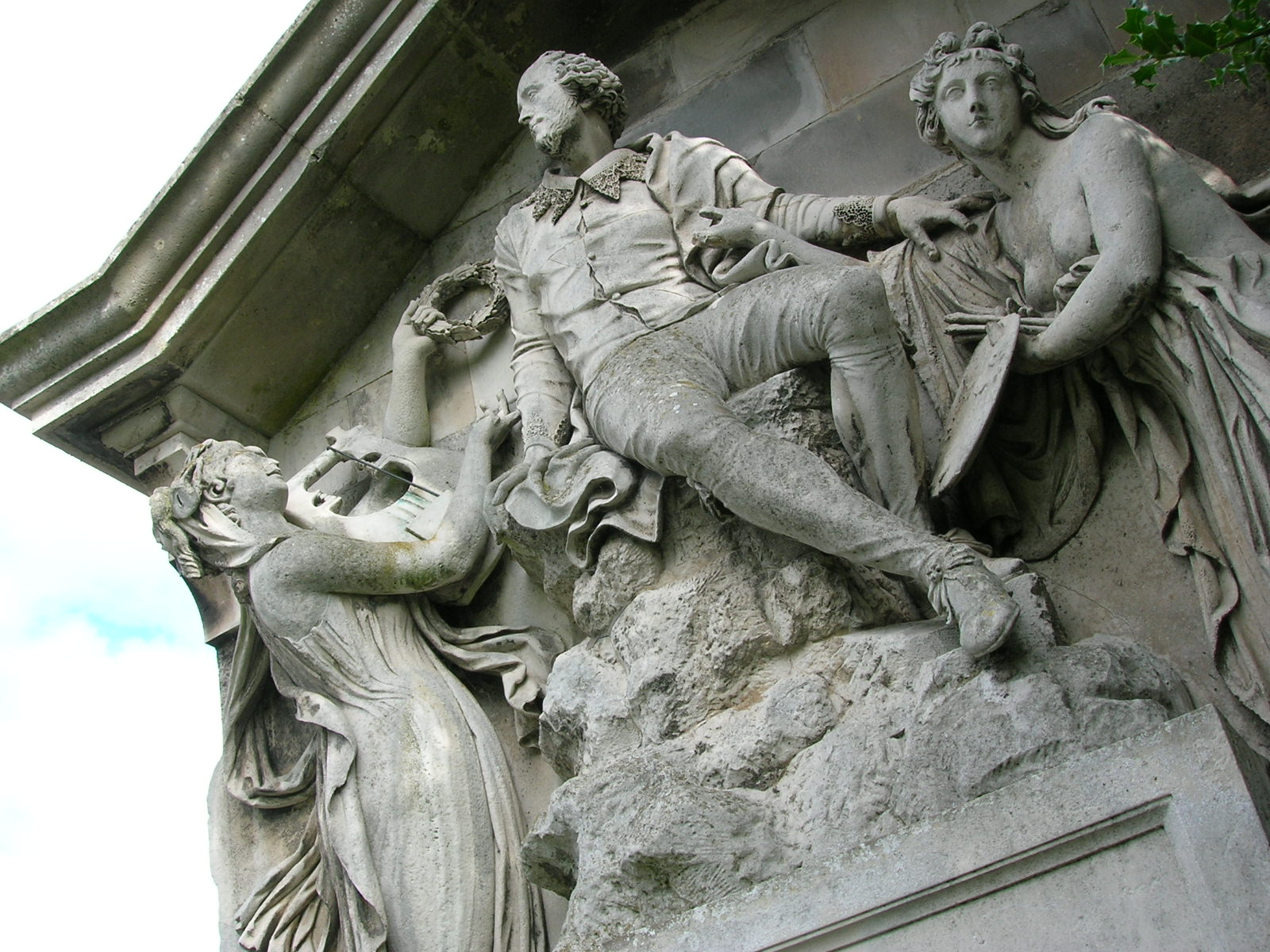 Statue of William Shakespeare, attended by painting and poetry personified, found in the gardens at New Place, Stratford-upon-Avon