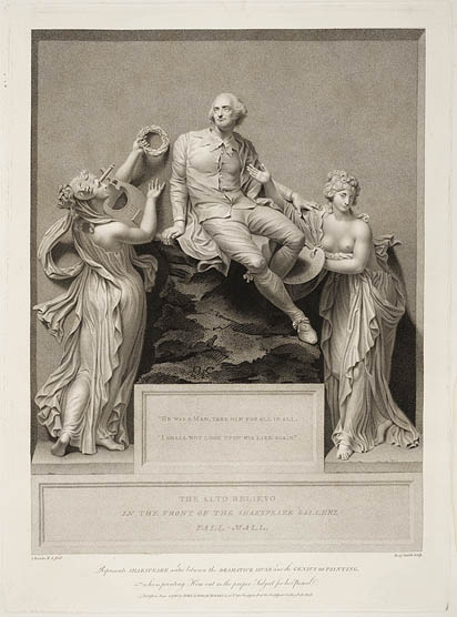The statue was commissioned by John Boydell, and was completed in 1789. It originally stood at the entrance to the Boydell Gallery, and was moved to Stratford in 1870.