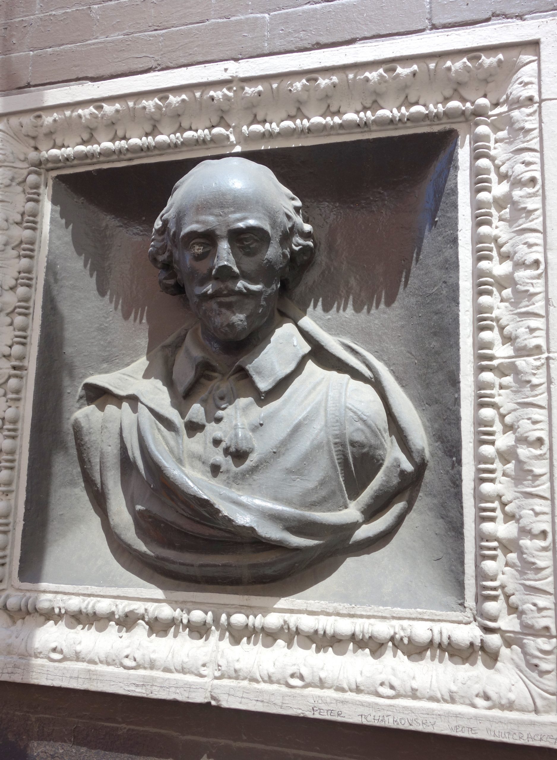 Bust of William Shakespeare on the facade of a house in Boston, Massachusetts.