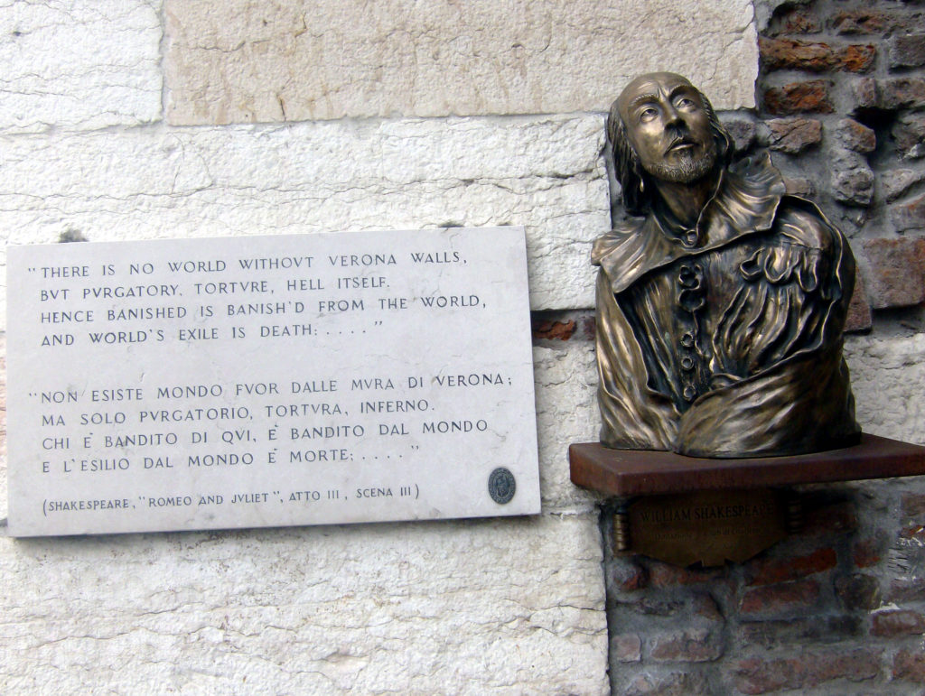 “The bust of William Shakespeare was made in 2003, bought by the Club of Juliet and later donated to the city of Verona. In the half length portrait, Shakespeare is portrayed with a grave face, looking at the sky.”