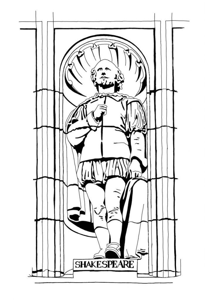 Statue of William Shakespeare, found on the facade of the Great Hall, among other luminaries. From left to right: Beethoven, Virgil, Michelangelo, Plato, Shakespeare, Newton, Watt, Faraday and Darwin.