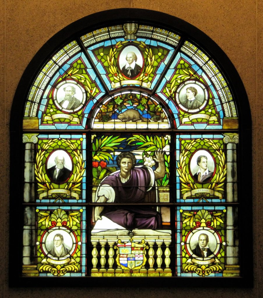 The window was originally installed in the Carnegie Library, but was moved to its current place in the Ottawa public library when the Carnegie was demolished in 1973. Shakespeare appears alongside Dickens, Tennyson, Thomas More and Archibald Lampman.
