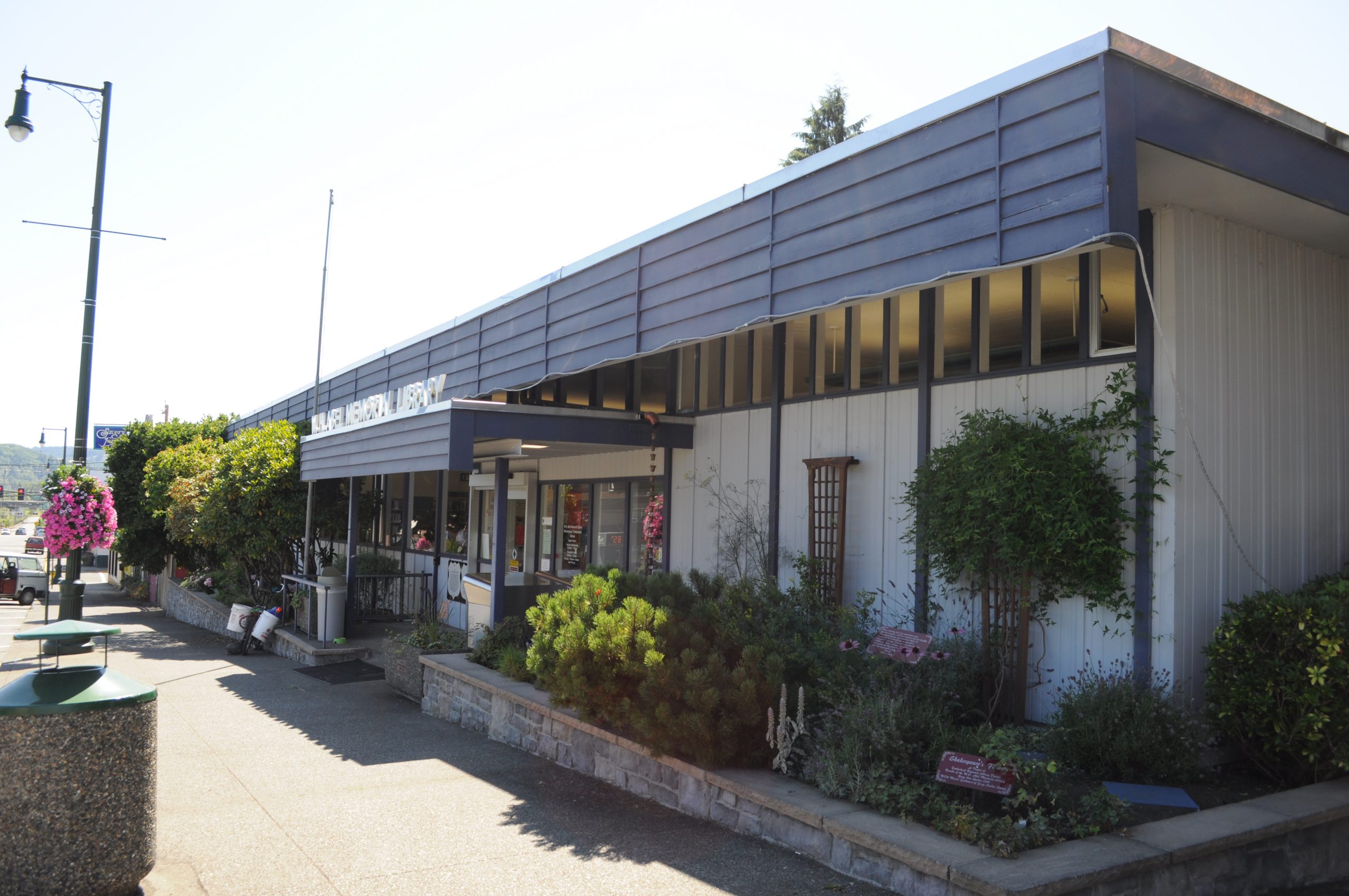 The plaque reads: ‘Shakespeare’s Flowers, A project of Timberland Regional Library District, Friends of W.H. Abel Memorial Library, Gung Ho Garden Club, and WSU Master Gardeners of Grays’ Harbor County.’