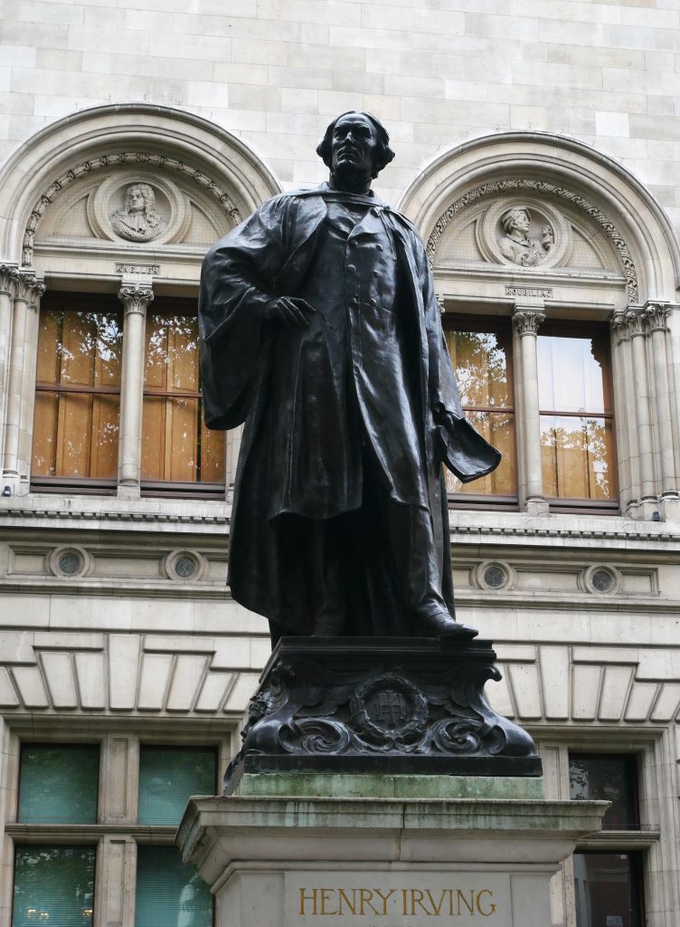 The inscription on the plinth reads: ‘Henry Irving Actor, born 1838, died 1905. Knight. Litt.D. Dublin, D. Litt. Cambridge, LL.D. Glasgow. Erected by English actors and actresses and by others connected with the theatre in this country.’