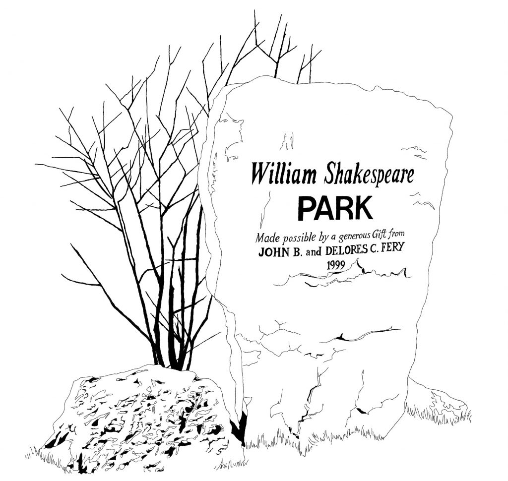 The park is marked by a standing stone, into which is carved “William Shakespeare Park – made possible by a generous gift from John B. and Delores C. Fery 1999”